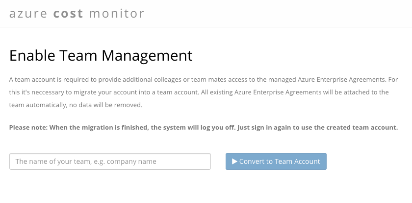 1) Log In to the Azure Cost Monitor Dashboard and if you don’t have a team account migrate to a team (optional):